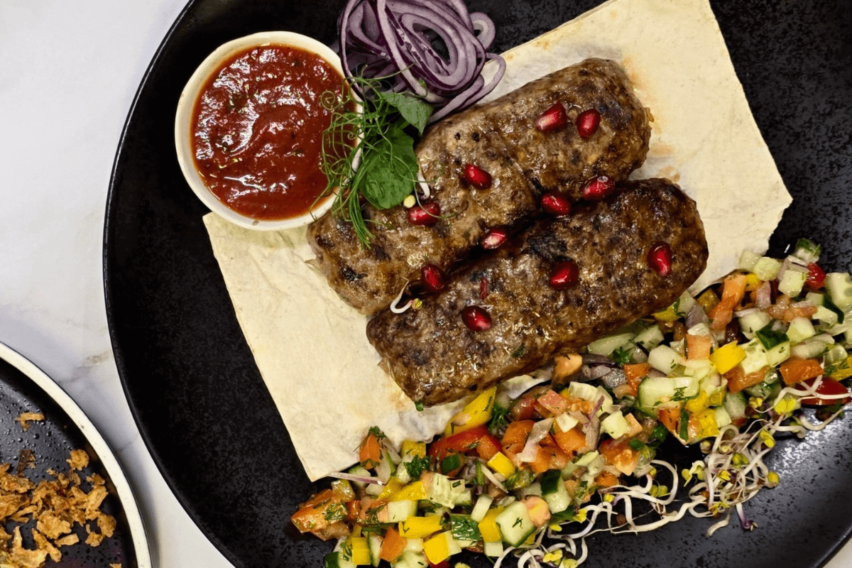• Kebab veise- ja sealihast, värske salat ja tkemali (Gruusia ploomikaste)